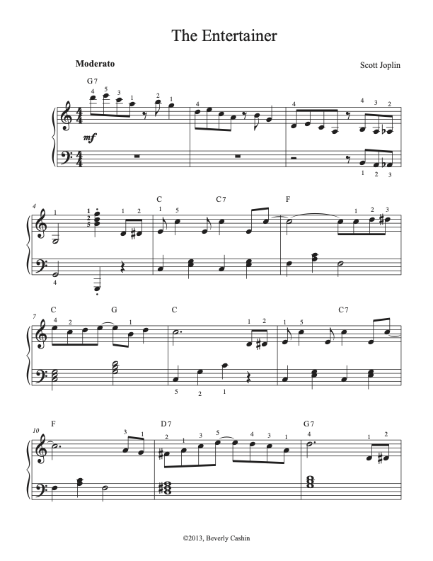 This is an early intermediate arrangement of the Scott Joplin classic. It is 3 pages long and contains the first 2 sections of the original music. Student should be able to move around the piano with some ease, and should also to be able to count 8th note rhythms.
