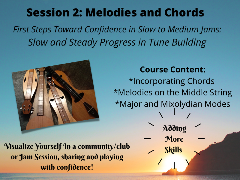 This course will move you into playing and hearing basic chord changes, and modes and tunes that can be found in most old-time and dulcimer jam sessions across the U.S. The focus of this course will be to extending songs that start below the scale on the middle string and finding those melodies by ear, which is a little more tricky than just the melody string melodies. And once again you will have access to audio and video recordings for study and practice and then song lyrics and tab upon completion of the course. We will also talk about basic jamming skills but more importantly, building more skills for you learn how to listen to tunes so you can play by ear for your own music interests, as well as playing with others. Both major and mixolydian song tunes will be taught in this course.
