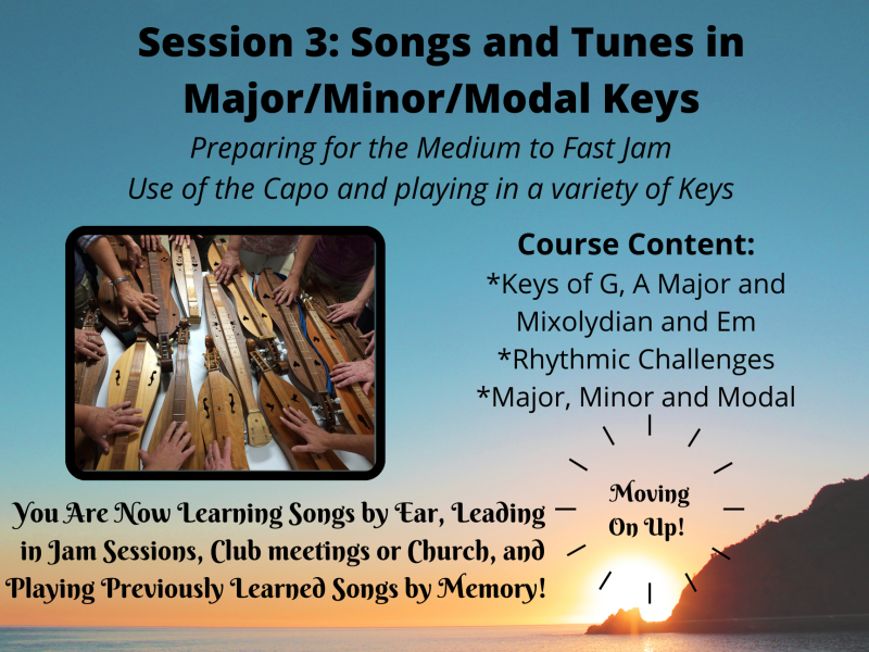 As you start to feel more confident, our tunes will move into more keys and more challenging rhythms. We will continue the key of D and add G, A and Em and you will start to pick out more songs by ear, lead songs in jam sessions and play more of your previously learned tunes by memory. These tunes will continue to help you recognize different modes, Ionian, Mixolydian, Aeolian and Dorian by sound and how to use the capo to easily play each of these. Moving the start of the scale extends your knowledge of your dulcimer and helps you to be more aware of the possibilities of playing tunes you hear and want to play. Once again, audio and video support is provided as well as PDFs upon completion of the course. This course really moves you into an intermediate player.