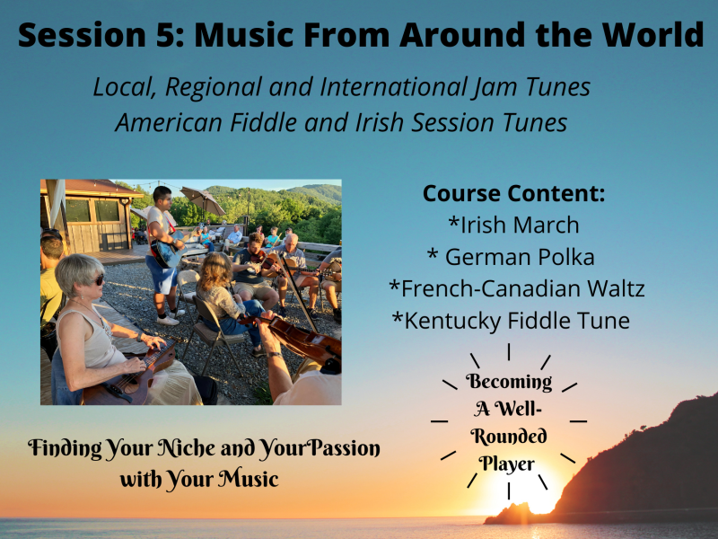 This is a course that offers some regional flavor of tunes. We will learn some great tunes from Kentucky fiddle players and start to look at other American roots music such as dance tunes from Scotland and Ireland. This session will guide you into finding your own niche and passion in your own community and how to contribute your new skills. This class will help you further develop your listening skills to songs and tunes that extend beyond our American folk music to other genres and cultures. All songs are carefully chosen for being dulcimer friendly and fun to play/sing. Audio, visual, PDF and moral support from your teacher and classmates all on cue as you move to this final stage of your journey. Treat yourself during this course and celebrate all you have learned!