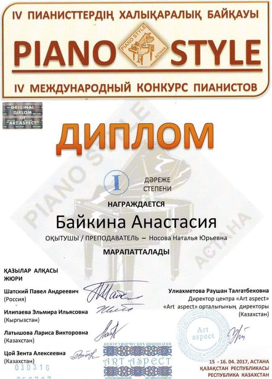- 1st Prize at Astana Piano Style (Kazakhstan)