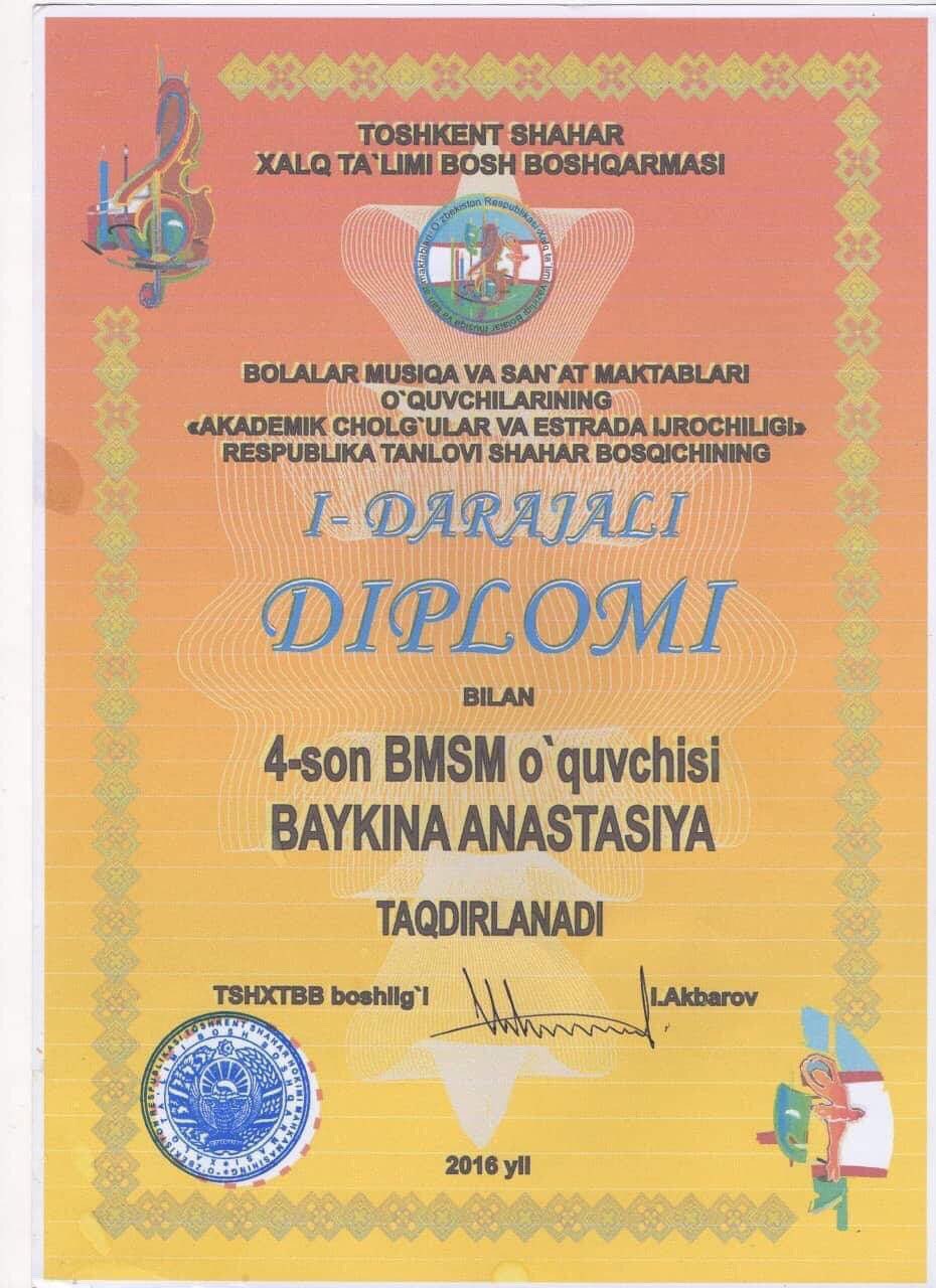 - Bachelor’s Degree in Piano Performance from the State Conservatory of Uzbekistan