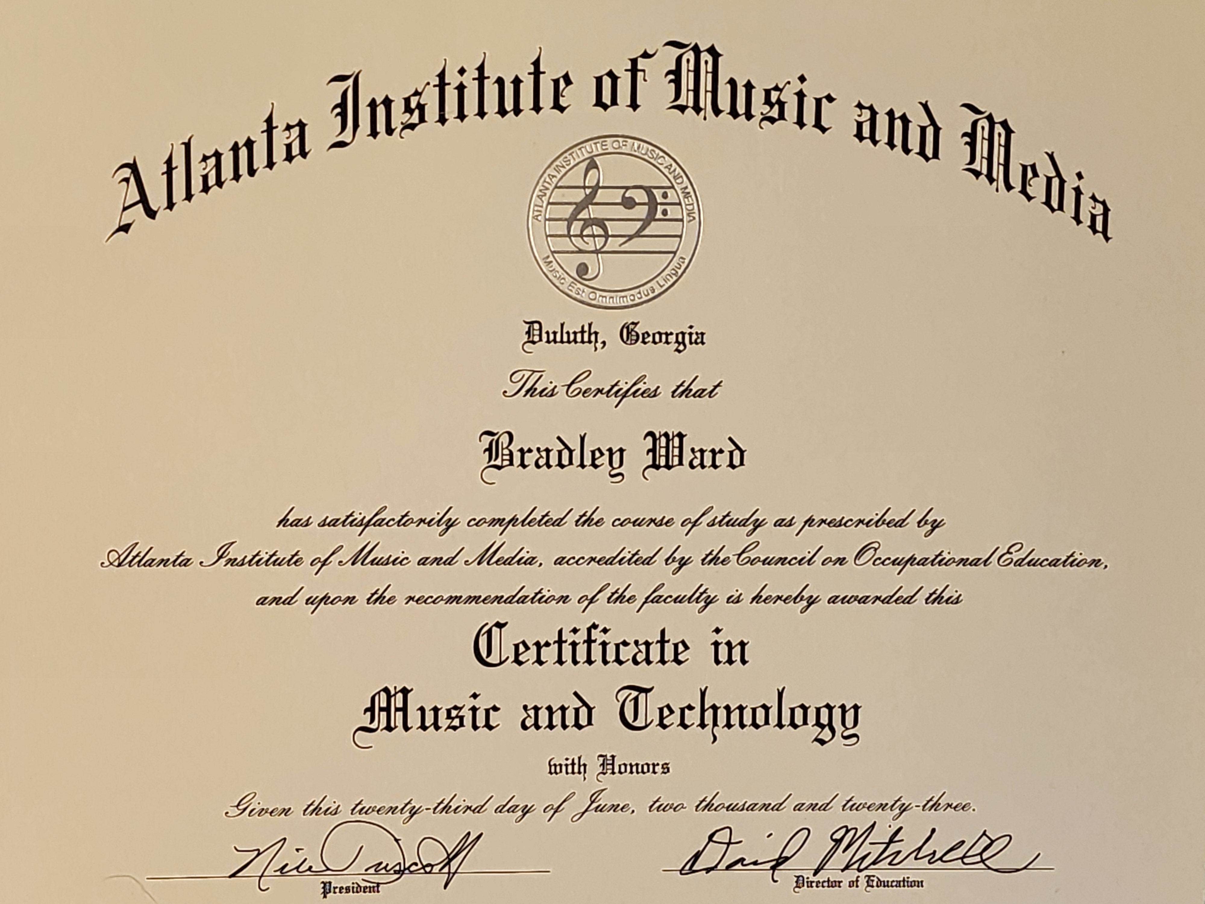 The Atlanta Institute of Music and Media - Music and Technology (Production) Certificate with a focus in guitar (2023)
