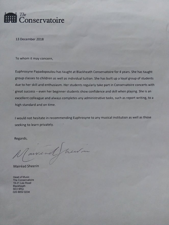 In 2005 she joined Philippos Nakas one of the greatest Music Colleges in Greece and in 2012 made the decision to relocate to London. Recently she joined the Blackheath Conservatoire of Music & Arts Ltd , Osho's Music Boutique and various agencies for private tuition.
