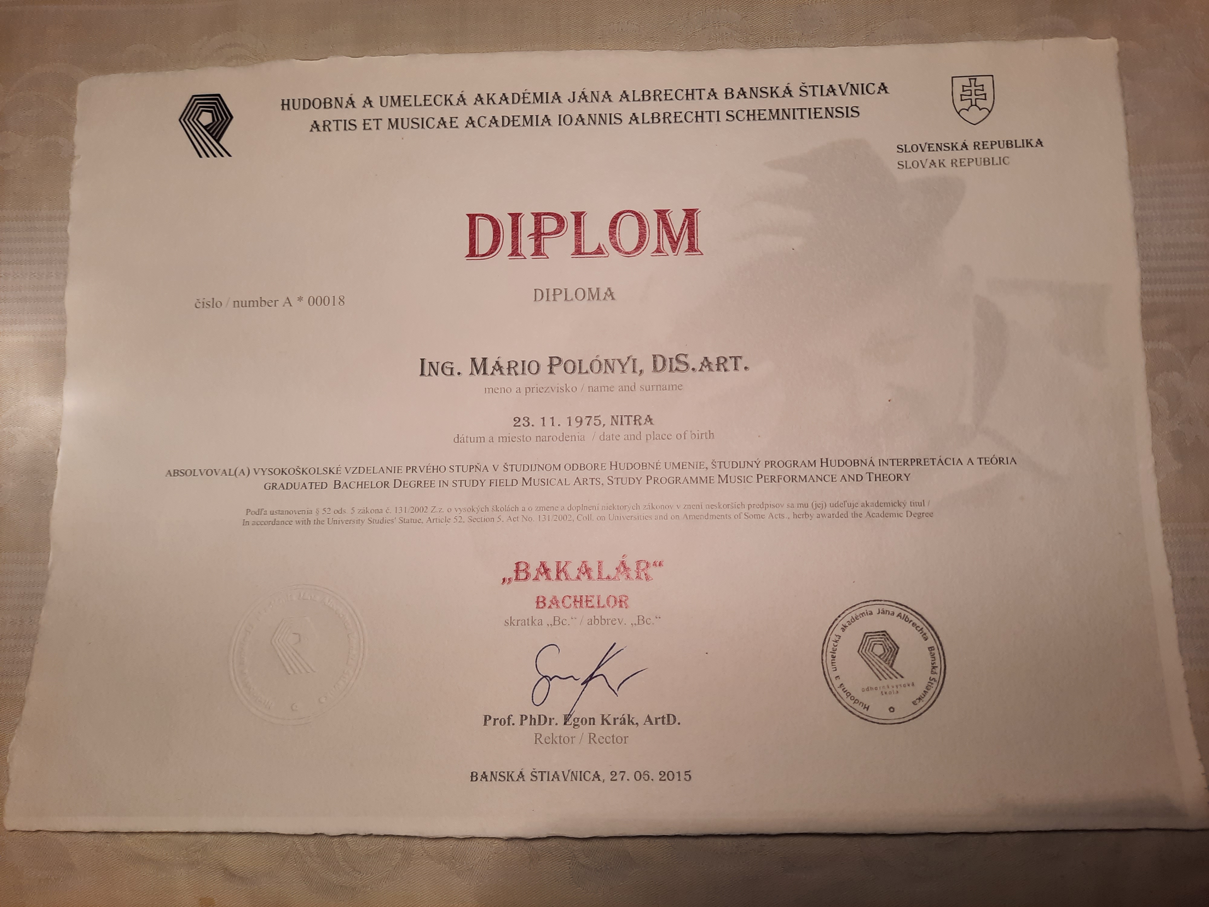 I completed my bachelor bass guitar studies at Ján Albrecht music and art academy Banská Štiavnica in 2016 and my master degree composition studies at the University of Performing Arts in Bratislava in 2023. Between 2001 and 2006 I was working as a guitar and bass guitar teacher for Musicana, a private musical academy in Bratislava. In 2016 and 2017 I was working as a bass guitar teacher in the Private Conservatory of Dezider Kardoš in Topoľčany, Slovakia. Since 2024, I've bee working as a guitar teacher in Art Pegas, en elementary music school in Bratislava. During all these years, I was also giving private music lessons.
