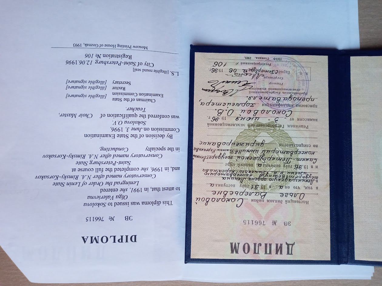 From 1987 to 1991 I had studied and graduated Music College (bachelor degree, 4 years course) Magnitogorsk, South Urals Russia with a major in Choir Conducting, piano and singing.