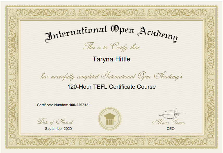 Kansas State Teaching License in Elementary Education (K-6), Kansas State ESOL Endorsement, 120 hour TESOL Certificate, 120 hour TEFL Certificate